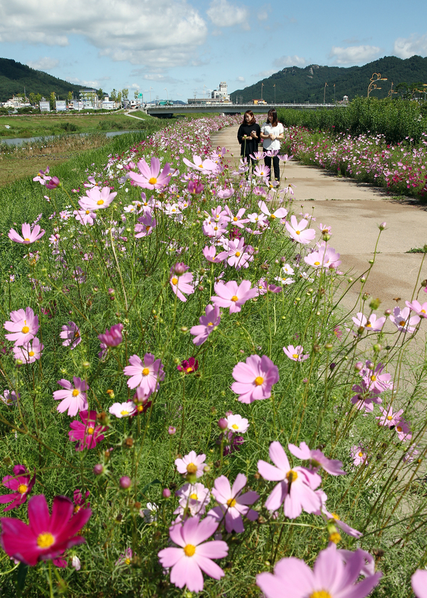 제15호 태풍 고니의 기운이 쇠잔한 26일 전남 함평군 함평읍 함평천변에 코스모스가 활짝 펴 가을향기를 물씬 풍기고 있다.