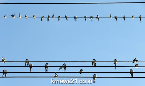 하동군 횡천면 남산리 상남마을 입구에 27일 이른 아침 수 천 마리 제비들이 부화한 새끼들을 데리고 전깃줄에서 떠오르는 햇살을 받고 있는 모습이 카메라에 잡혔다.