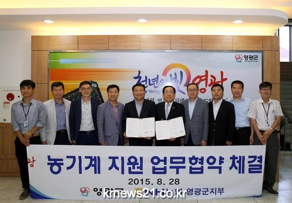 영광군(군수 김준성)은 8월 28일 NH농협 영광군지부(지부장 김충현)와「2015년 농기계 지원 업무협약」체결식을 개최하였다.
