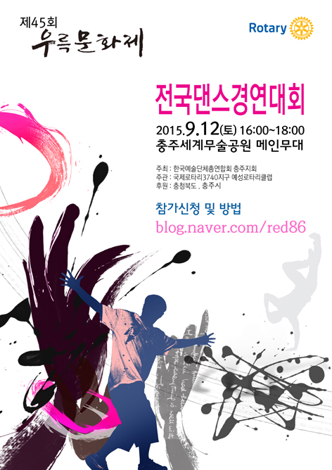 대한민국 젊은이들의 끼와 열정을 표출하고 건전한 여가선용의 장 을 마련하고 건전한 놀이문화 창출을 통해 자기개발 및 사회참여 등 올바른 가치관을 형성시키고자 예성로타리 클럽(회장 심창구)에서는 제45회 우륵문화제를 기념하여 2015 전국댄스경연대회를 개최한다.