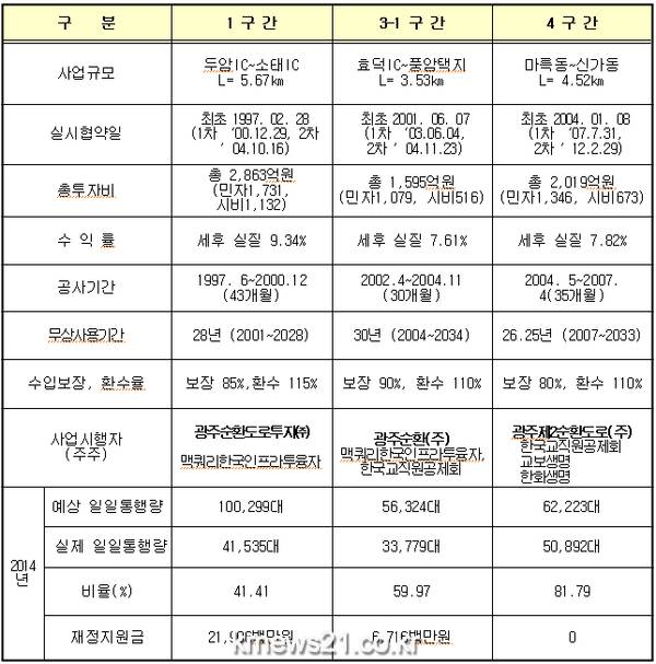 시에서 지급해온 제2순환도로 1구간 보조금이 맥쿼리의 추가이자지급에 부당하게 사용되고 있다고 판단하고 지난해 5월 보조금 지급 중지처분을 내렸으며, 이에 대해 사업자가 제기한 보조금 중지처분 무효 확인소송에서 1심 재판부가 최근 처분성이 없는 것으로 ‘각하’ 판결을 내림에 따라 보조금 지급여부를 검토하였으나 광주시는 보조금 지급중지를 유지키로 방침을 정했다.