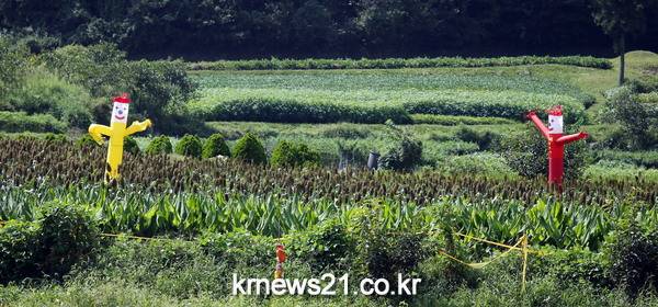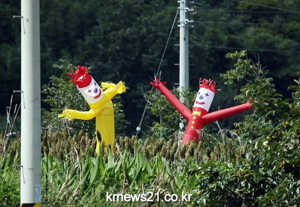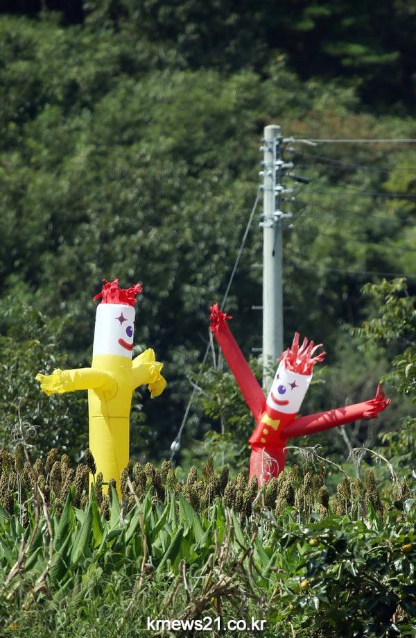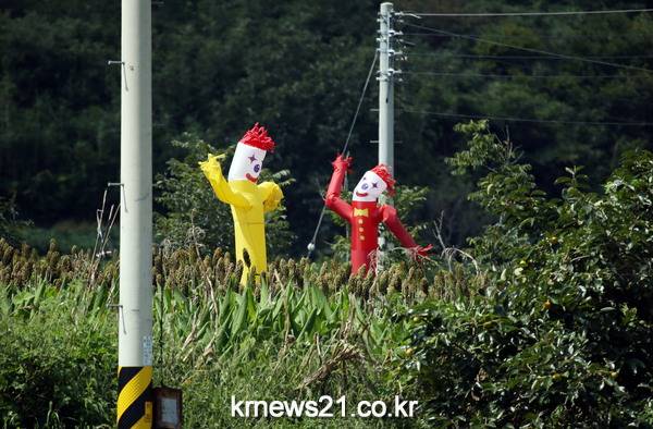 다소 쌀쌀한 날씨를 보인 지난 16일 전남 강진군 작천면 박산마을 수수밭에서 익어가는 수수를 먹으려고 날아드는 새를 쫓기 위해 농부가 설치해놓은 스카이댄서의 요란한 몸부림이 우스꽝스럽다.
