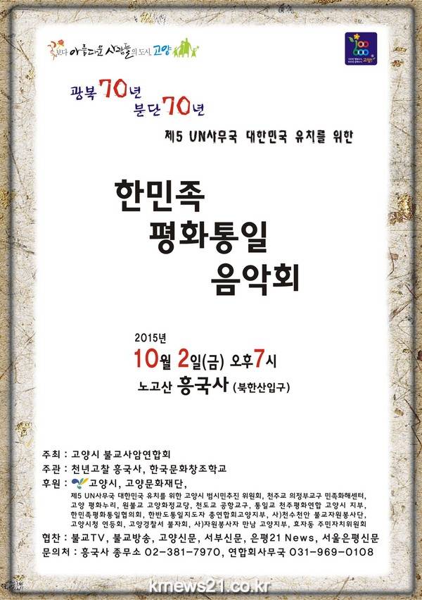 고양시 불교사암연합회가 오는 2일 저녁 7시 ‘한민족 평화통일 음악회’를 고양시 흥국사에서 개최한다.