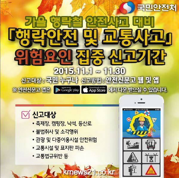 집중 안전신고 기간은 11. 1 ~ 11. 30까지로 모든 시민이 언제 어디서나 안전신문고로 신고할 수 있으며, 주요 신고대상은 축제장, 캠핑장, 등산로, 불법 취사·소각장, 교통안전 시설물 등 가을 행락철에서 발견할 수 있는 모든 안전위협 요소이다.