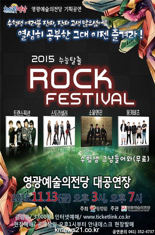 영광군(김준성 군수)은 수능을 마친 수험생과 학부모를 위한 특별공연을 11월 13일 오후 3시, 저녁7시 대공연장에서 2015 수능탈출 ROCK(락) 페스티발을 개최한다.