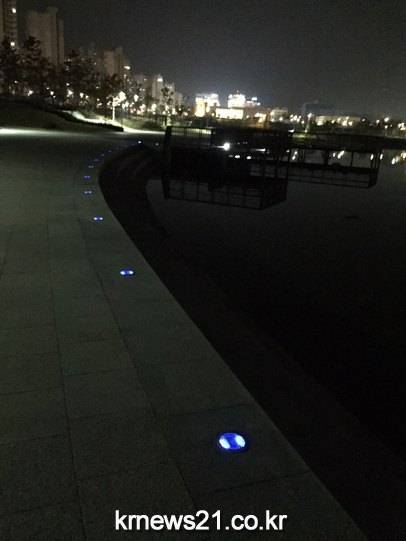 안전보행등은 호수 경계를 따라 2.5M 간격으로 설치됐는데 바닥분수 부근에는 청색 LED등을, 운동시설 부근에는 백색 LED등을 배치해 야간에 호수공원을 찾는 시민이 쉽게 식별할 수 있도록 했고, 운치있고 분위기 있는 경관미까지 연출했다.