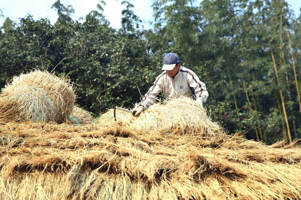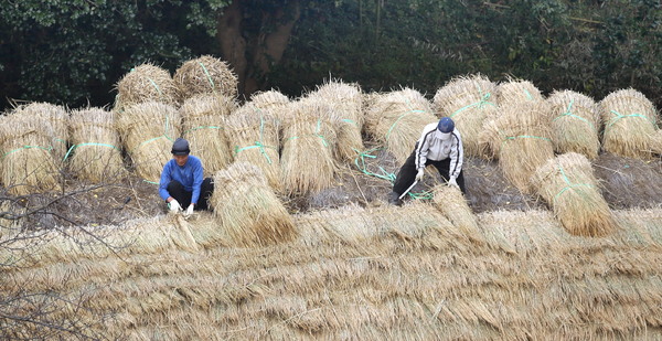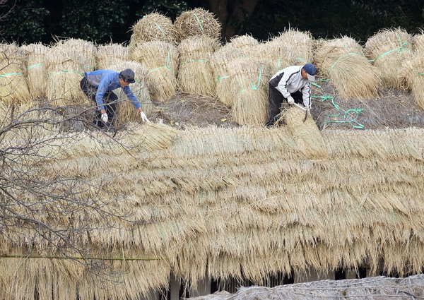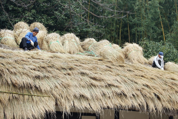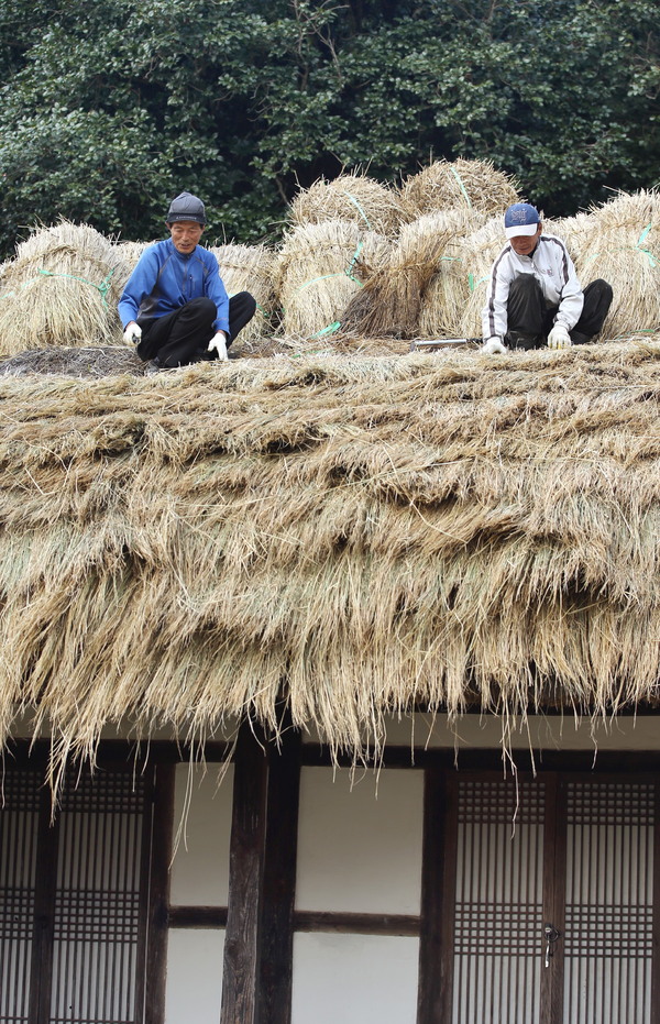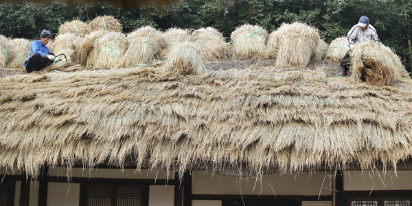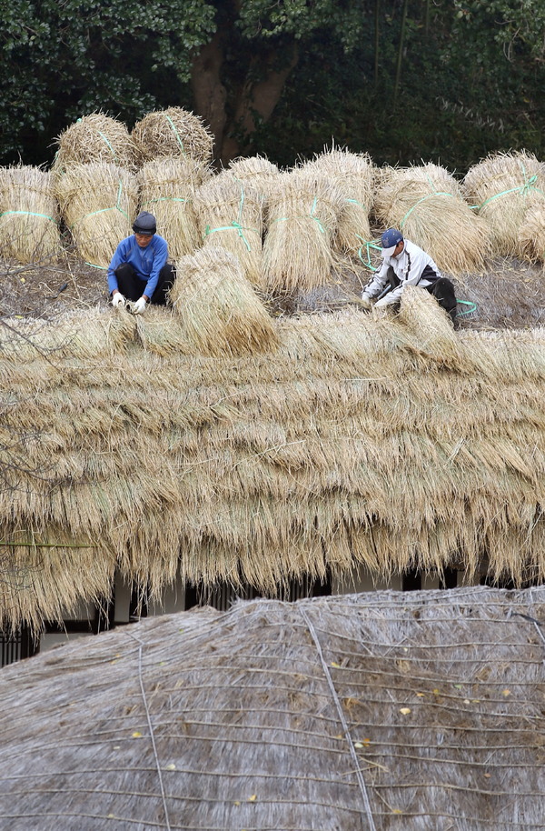 포근한 날씨를 보인 지난 달 30일 전남 강진군 강진읍 영랑생가(국가지정 중요민속문화재 252호) 안채지붕이 새로 만든 이엉으로 갈아입어 산뜻한 모습으로 단장되고 있다.