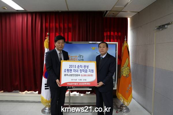 광주광역시소방안전본부는 보성장학재단(이사장 이화영)이 22일 시청 16층 회의실에서 광주시 순직․공상 소방공무원 자녀들을 위한 장학금 800만원을 기탁했다고 22일 밝혔다.