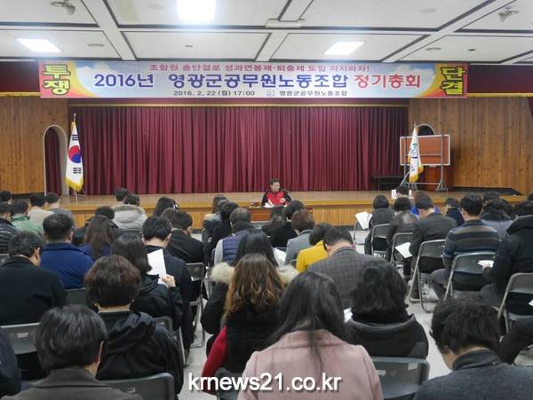 영광군공무원노동조합(위원장 김관필)은 지난 22일 군청 3층 회의실에서 조합원 300여명이 참석한 가운데「2016년 영광군공무원노동조합 정기총회」를 개최했다.