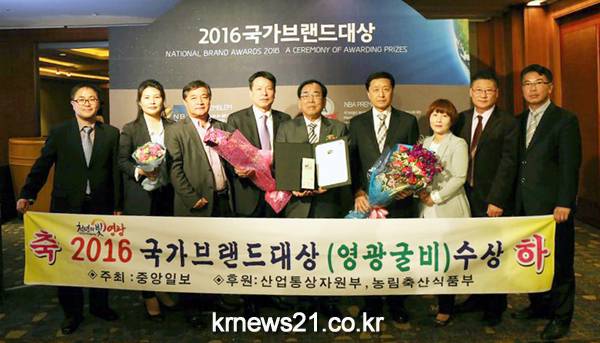 영광군(군수김준성)은 지난 4월 4일 중앙일보 주최하고, 산업통상자원부와 농림축산식품부가 후원하는, 2016 대한민국 국가브랜드대상(NBA)에 영광군의 대표 특산물인 “영광굴비”가 대상을 수상하여 지난해에 이어 대상의 수상의 영예를 안았다.