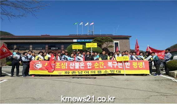 이날 행사는 봄철 건조한 기후로 산불이 빈번하게 발생함에 따라 주민들에게 산불예방 경각심을 고취하기 위해 마련된 것으로 화촌면 남. 여 의용소방대원 60여 명 및 화촌면 직원 10여 명이 참석, 산불예방을 다짐하는 결의대회 개최에 이어 관내 산불 취약지역에서 산불예방 현수막 및 실천방안이 담긴 리플릿 등을 나누어 주며, 산불에 대한 경각심을 일깨웠다.