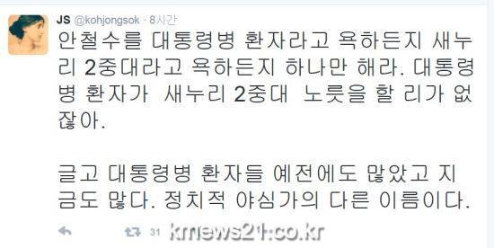 또 “안철수를 대통령병 환자라고 욕하든지 새누리 2중대라고 욕하든지 하나만 해라. 대통령병 환자가 새누리 2중대 노릇을 할 리가 없잖아”라고 했다.
