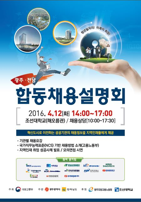 광주광역시는 국토교통부, 전라남도와 함께 12일 오후 2시부터 조선대학교 해오름관에서 ‘광주·전남혁신도시 이전공공기관 합동채용설명회’를 개최한다.