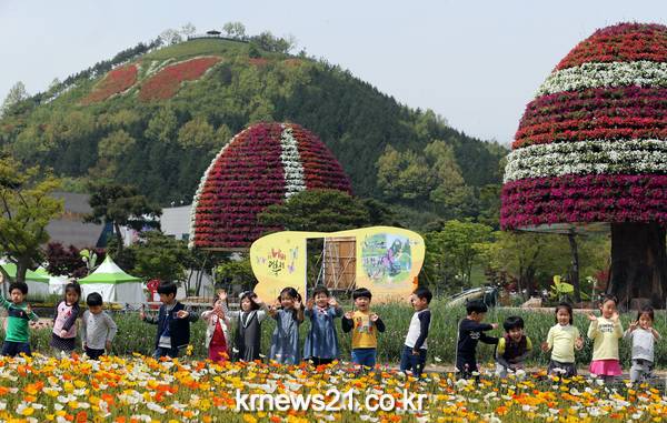 제18회 함평나비대축제 개막을 사흘 앞둔 26일 전남 함평군 함평읍 함평엑스포공원에서 아이들이 꽃밭을 거닐며 봄소풍을 즐기고 있다.