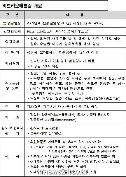 특히, 만성 간 질환, 당뇨병, 알콜중독자 등 기저질환을 가진 고위험군은 비브리오패혈증균에 감염될 경우 치명률이 높으므로 어패류를 충분히 익혀 먹는 등 예방수칙을 준수해야 한다.