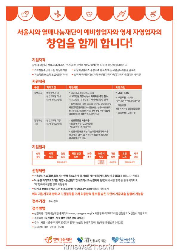 2016년 ‘서울형 마이크로크레딧’은 현재 상반기 지원대상자를 모집 중이며, 자세한 사항은 열매나눔재단 홈페이지 공지사항을 통해 확인할 수 있다. 지원 상담은 전화로 하면 된다. 아울러 창업자가 한부모 여성가장이라면 무담보 무이자로 지원되는 열매나눔재단의 메리맘 사업을 추천한다.