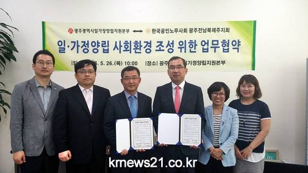 광주광역시일가정양립지원본부는 26일 본부 회의실에서 한국공인노무사회 광주전남북제주지회와 일․가정 양립 사회환경 조성을 위한 업무협약을 체결했다.