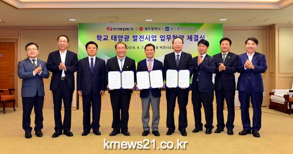 광주광역시는 한전KPS(사장 최외근), 시교육청(교육감 장휘국)과 7일 오후 시청 3층 비즈니스룸에서 신재생에너지 보급 확대를 위한 ‘학교 태양광 발전사업’ 업무협약을 체결했다고 밝혔다.
