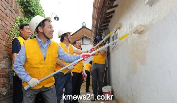 윤장현 광주광역시장과 재능기부로 참여한 40여 명으로 구성된 ‘행복한 목수 봉사단’은 7일 동구 동명동의 저소득 가정인 조모 씨의 낡은 주택을 대대적으로 수리했다.