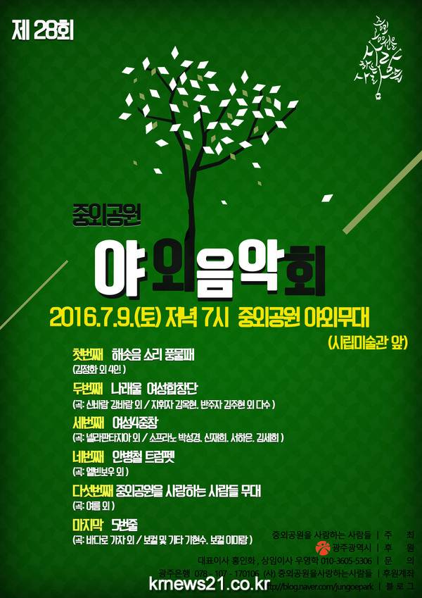 광주광역시가 후원하고 "중외공원을 사랑하는 사람들"이 주최하는 제28회 "중외공원 야외음악회"가 7월 9일 토요일 저녁 7시에 중외공원 야외공연무대에서 열린다.