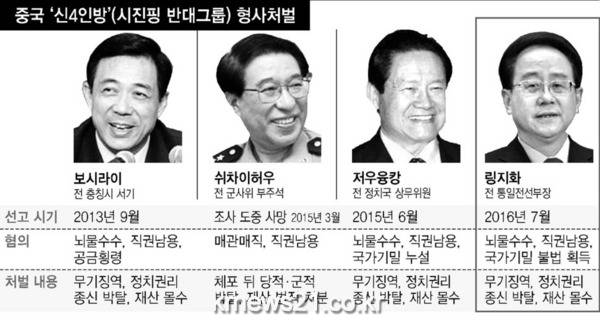링 전 부장을 끝으로 이른바 ‘신 4인방’으로 불리던 인물들은 모두 형사처벌을 받았다. 2014년 말 <보쉰> <명경신문망> 등 미국에 서버를 둔 중화권 매체들은 중국 내 소식통을 인용해, 링 전 부장과 저우융캉 전 정치국 상무위원, 보시라이 전 충칭시 서기, 쉬차이허우 군사위 부주석 등 4명이 시진핑 지도부에 반기를 든 ‘신 4인방’이라고 전했다. 이들 4명은 시 주석의 반부패 드라이브 속에 제거된 대표적인 ‘호랑이’(거물급)들로, 지병으로 숨진 쉬 전 부주석을 빼면 모두 무기징역형을 받았다.