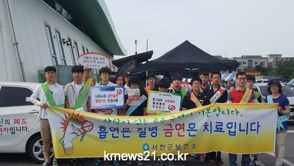 서천군보건소(소장 김재연)는 18일 장항전통시장에서 엄마와 함께하는 금연서포터즈 충남조선고 팀 20명과 함께 수업 시작 전 시간을 활용해
