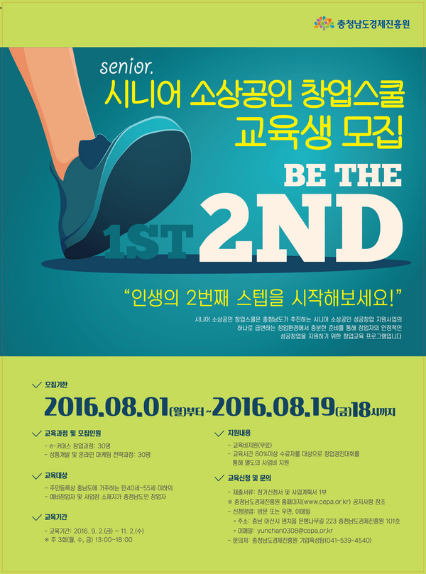 충남경제진흥원(원장 나윤수)은 오는 8월 1일부터 19일까지 “시니어 소상공인 창업스쿨” 교육생을 모집한다고 밝혔다.시니어 소상공인 창업스쿨은 충청남도가 추진하는 시니어 소상공인 성공창업 지원사업의 하나로 급변하는 창업환경에서 충분한 준비를 통해 창업자의 안정적인 성공창업을 지원하기 위한 창업교육 프로그램이다.교육대상자는 주민등록상 도내 거주하는 만40~55세 이하의 창업희망자 및 사업장 소재지가 충청남도인 창업자이다.교육과정은 e-커머스 창업과정, 상품개발 및 온라인 마케팅 전략과정 등 2개 과정으로 이론교육과 실습교육으로 구성되어 있다. 교육기간은 9월부터 11월까지 3개월간 진행된다. 무료 교육으로 진행되는 이번 교육은 교육시간 80%이상 수료자를 대상으로 창업경진대회를 통해 별도의 사업화 지원비를 지원할 계획이다. 참여를 희망하는 (예비)창업희망자는 오는 1일부터 충남경제진흥원(http://www.cepa.or.kr) 홈페이지(공지사항 참조)에서 신청서를 내려 받아 작성 후 신청할 수 있다. 자세한 사항은 충남경제진흥원 기업육성팀(041-539-4540)으로 문의하면 된다.사업담당자 : 기업육성팀 임윤찬 과장 041-539-4540