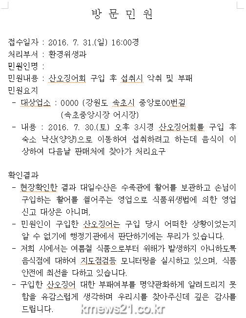 ▲ ⓒ속초시 중앙시장연일 계속되는 폭염으로 식중독 위험 발생이 높아지고, 특히 여름철 위생 관리 주의가 요구되는 시점에서 지난 31일 15시경 경기도 석 모씨(여,62세)가 속초시 중앙시장 오징어 활어 집에서 3만원에 구입한 오징어가 악취가 심하고 음식물이 짜서(다른 오징어 활어 집에 문의한바 오징어가 짠 이유는 죽은 오징어를 썰어주었기 때문이라고 함.) 먹을 수 없어 식당에 전 후 사정을 이야기 하였으나, 오징어 활어 주인은 그런 일이 없다며 극구 부인, 결국 112에 신고했다고 한다.