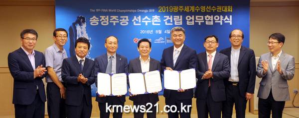 광주광역시는 4일 오전 광주시청 비즈니스룸에서 송정주공재건축정비사업조합, 중흥건설(주)와 2019광주세계수영선수권대회 선수촌 건립 협약을 체결했다.