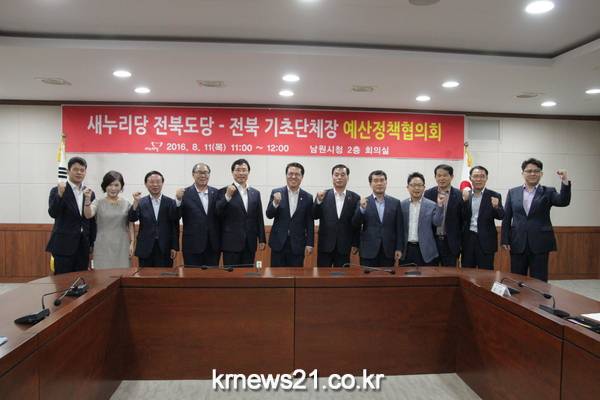 새누리당 전북도당(위원장 정운천)은 8월 11일(목) 오전 11시, 남원시청 2층 회의실에서 남원시와 완주군, 진안군, 무주군, 장수군, 임실군, 순창군 등 7개 시․군 자치단체장이 모두 참석한 가운데, 지역현안 해결과 2017년도 국가예산 확보를 위한 예산정책협의회를 개최했습니다.