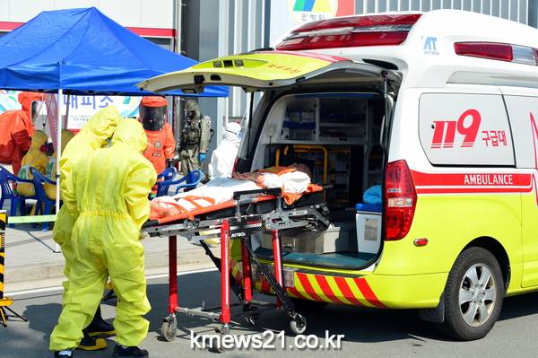 시는 이날 인명 살상이나 사회 혼란 등을 목적으로 탄저균(백색가루)을 사용한 생물테러 발생을 가상해 ▲챔피언스필드 초기대응 ▲경찰의 유관기관 상황전파 및 통제, 테러요원 진압 ▲31사단 주변지역 경계 및 출입 통제·차단 ▲영산강유역환경청 테러물질 최초 탐측 ▲보건소 다중키트검사, 폭로자 응급처지, 예방처치, 인체제독, 환경검체 검사 이송 의뢰 ▲소방서의 환경검체 체취, 환경제독, 환자이송 등 훈련에 직접 참여한 유관기관들이 전 과정을 실전처럼 재현 일사분란하게 대응하는 훈련을 진행했다.