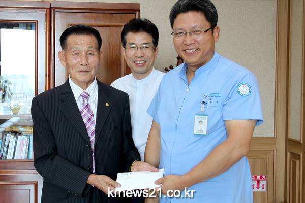 정읍영생교회 김재조 원로목사 : 평소의 교회 혜택에 감사, 발전기금 후원 9월 1일에 정읍영생교회 김재조 원로목사가 예수병원을 방문해 권창영 병원장에게 예수병원 발전기금 100만원 직접 전달했다.
