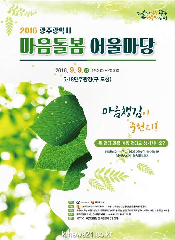 광주광역시는 정신건강 및 자살예방의 날을 기념해 정신건강의 중요성을 강조하고 생명존중문화 조성을 위해 9일 오후 3시 5․18민주광장에서 ‘2016 광주광역시 마음돌봄 어울마당’ 행사를 개최한다.
