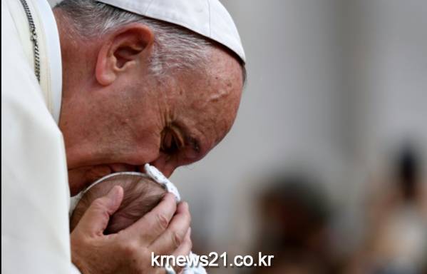 프란치스코 교황이 로마 교황 성 베드로 광장에서 한 신생아를 감싸안으며 입맞춤을 하고 있는 모습.