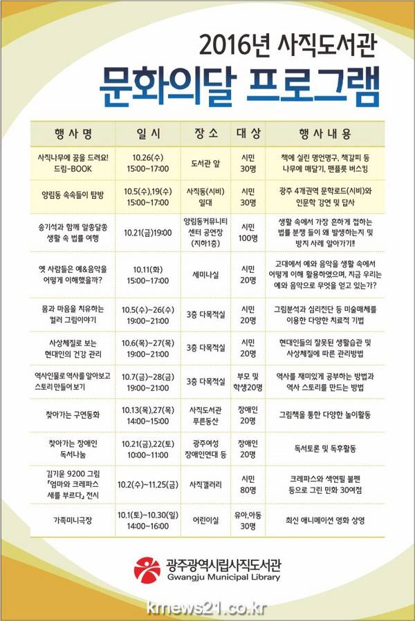 10월5일과 19일에는 광주 4대권역 문학로드 ‘양림동 속속들이 탐방’ 인문학 강연과 답사를 하고, 26일에는 독서 확산을 위해 ‘사직나무에 꿈을 드려요! 드림-BOOK’ 체험, 팬플룻 버스킹 행사가 열린다.