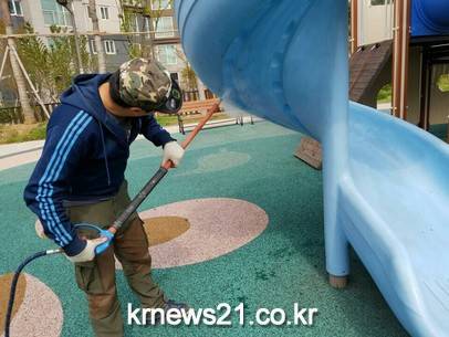 김포시가 어린이들이 안심하고 뛰어 놀 수 있는 깨끗한 어린이 놀이공간을 제공하기 위해 관내 어린이놀이시설 71개소를 대상으로 놀이기구 및 포장재 위생소독에 나섰다.
