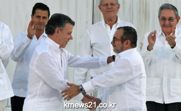 FARC 지도자 로드리고 론도뇨(일명 티모첸코)와 후안 마누엘 산토스 콜롬비아 대통령이 26일(현지시간) 콜롬비아 북부 해안도시 카르타헤나에서 평화협정안에 공식 서명한 뒤 악수하고 있다.