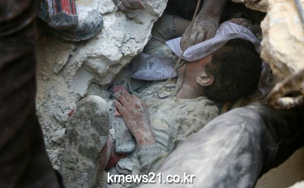 11일(현지시간) 러시아의 대대적 공습이 있었던 시리아 알레포 동부 반군지역의 건물 잔해에서 구출된 어린이가 산소 공급을 받고 있다.