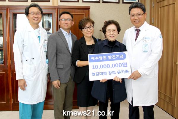 10월 13일(목)에 예수병원 김철승 진료부장의 부친인 고 김대현 장로의 유가족이 예수병원 발전기금으로 1천만원을 후원했다. 고 김대현 장로의 유가족들은 이날 예수병원 권창영 병원장을 방문해 “그동안 김대현 장로님의 치료를 위해 정성을 다해주신 의료진에게 감사를 드린다. 고인의 뜻에 따라 아름다운 주님의 손길로 봉사하는 예수병원의 더 큰 발전을 기원하며 예수병원 발전기금을 전한다.”며 발전기금을 전했다.