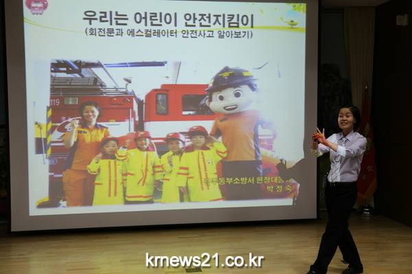 이날 각 소방서 대표로 참가한 소방안전강사 5명은 ‘회전문이나 에스컬레이터는 조심히 타고 내려요’라는 공통 주제로 체험교육 강의 실력과 교육콘텐츠 개발 성과를 겨뤘다.