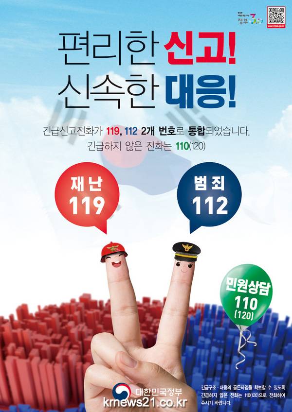 긴급신고전화 통합서비스는 긴급 상황에서 시민들의 편리한 신고와 빠른 대응를 위해 긴급재난신고는 119, 범죄신고는 112, 민원상담은 110으로 통합해 운영하는 서비스다.