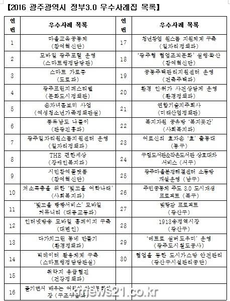 광주광역시는 정부3.0 추진 4년차를 맞아 올 한해 시가 추진한 정부3.0 성과를 모아 ‘2016 광주광역시 정부3.0 우수사례집’을 30일 발간했다.
