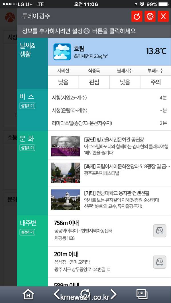투데이 광주 서비스는 필요한 정보만 한눈에 모아서 볼 수 있는 맞춤형 메뉴다. 현재 날씨, 관심 있는 문화행사 정보, 자주 이용하는 버스노선 정류장의 실시간 도착정보를 제공받을 수 있다. 공공와이파이, 공공화장실, 관광명소, 숙박업소, 광주 맛집 등 내 주변 정보를 선택해 볼 수도 있다.