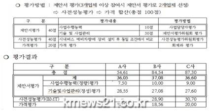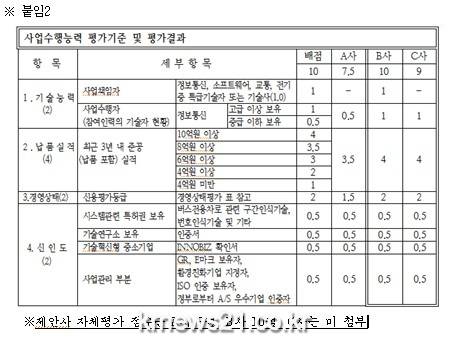 사업담당자(공무원)가 평가한 ‘사업수행능력평가’는 입찰공고에 공개된 세부기준과 내용에 따라 제안사가 제출한 공인기관 발행서류에 의거, 기술능력으로 사업책임자와 사업수행자의 기술 자격여부(한국정보통신공사협회발행), 납품실적으로 최근 3년내 준공 실적(계약서 사본), 경영상태로 신용평가등급(한국기업데이터 발행), 신인도(특허증 등) 4부분으로 평가되었으며, 이는 제안사가 자체 평가해 제출한 점수와도 거의 차이가 없음.