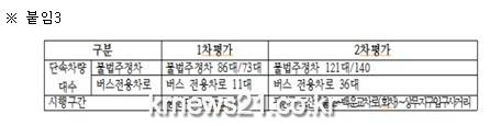 2차 사전성능평가는 1차 평가 때 보다 단속차량대수를 늘리고 시행 노선구간을 연장하여 실시하였으며, 그 내용은 아래와 같음.