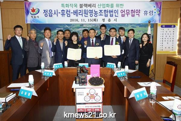 정읍시와 건강식품 전문기업인 휴럼, 베리원영농조합법인(이하 베리원)이 지난 15일 시청 2층 영상회의실에서 블랙베리 산업화를 위한 업무협약을 체결했다.