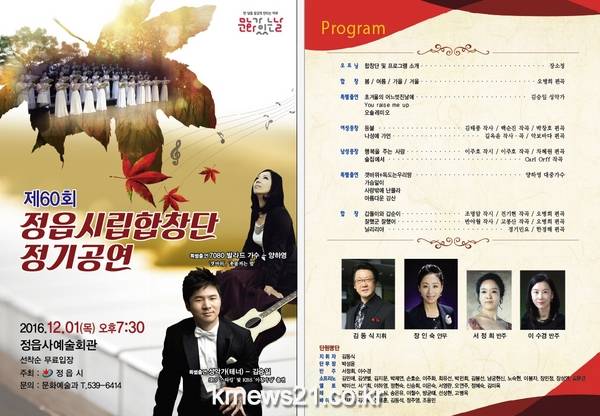 정읍시립합창단이 12월 1일 저녁 7시30분 정읍사예술회관에서 정기공연을 갖는다.