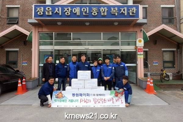 ‘Total packaging 전문기업’으로 발전하고 있는 태림그룹 동원페이퍼〔(주), 대표 김영식〕 정읍공장(이하 정읍공장, 덕천면 제1산업단지)과 정읍시장애인복지관(이하 장애인복지관)은 지난달 30일 사랑의 김장 나눔 행사를 가졌다.