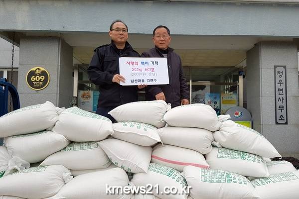 정우면 남산마을 귀농인 고현수(65세)씨가 지난 달 30일 연말연시를 맞아 어려운 이웃들에게 전달해 달라며 쌀 1천200㎏(60포대, 200만원 상당)을 정우면에 기탁했다.