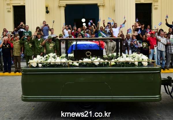 ▲ AFP / Ronaldo SCHEMIDT [제공자ⓒ 뉴스21통신. 무단전재-재배포 금지.]피델 카스트로의 유골이 들어있는 항아리는 4일 동안 산타 클라라, 쿠바의 거리를 통해 수송 될 예정이다.